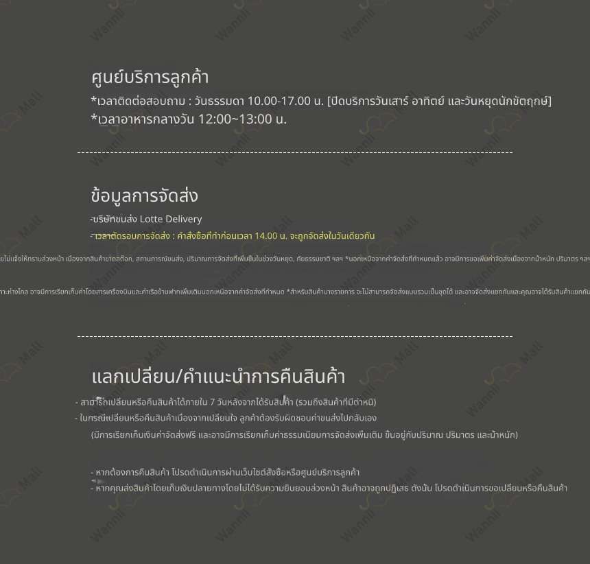 • หากคุณต้องการเปลี่ยนหรือคืนสินค้า กรุณายื่นคำขอภายใน 7 วัน หลังจากได้รับสินค้า โดยติดต่อศูนย์บริการลูกค้า Wannii Mall (together1@wannii.com หรือ 070-4256-8800)