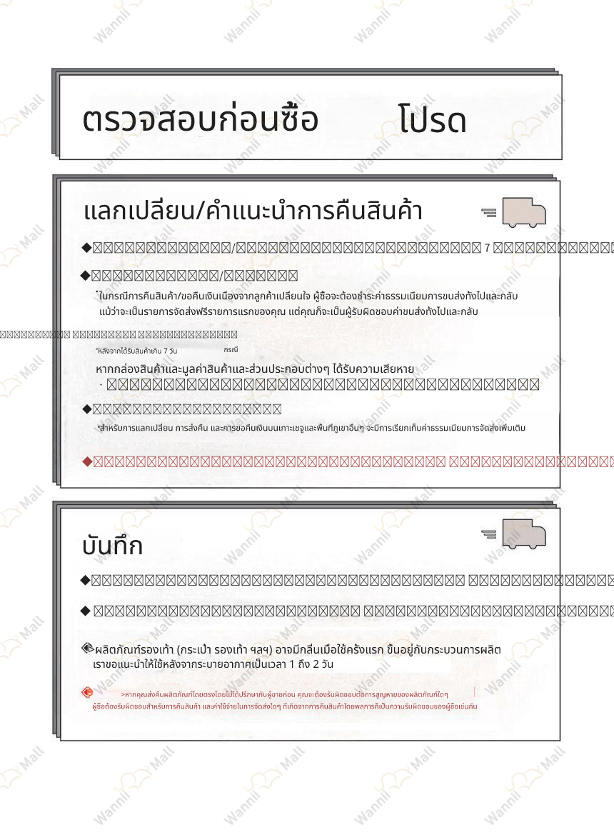 • หากคุณต้องการเปลี่ยนหรือคืนสินค้า กรุณายื่นคำขอภายใน 7 วัน หลังจากได้รับสินค้า โดยติดต่อศูนย์บริการลูกค้า Wannii Mall (together1@wannii.com หรือ 070-4256-8800)