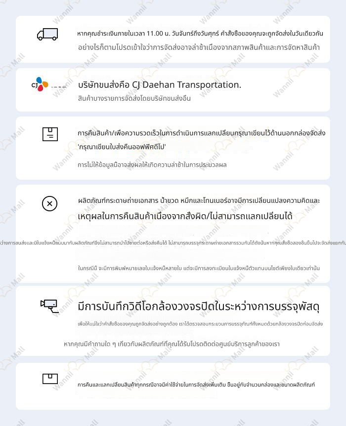 • กรณีที่สินค้ามีตำหนิ หรือจัดส่งผิดพลาด ทาง Wannii Mall จะเป็นผู้รับผิดชอบค่าจัดส่ง