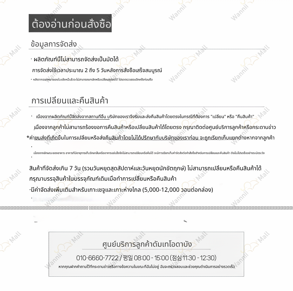 • หากคุณต้องการเปลี่ยนหรือคืนสินค้า กรุณายื่นคำขอภายใน 7 วัน หลังจากได้รับสินค้า โดยติดต่อศูนย์บริการลูกค้า Wannii Mall (together1@wannii.com หรือ 070-4256-8800)