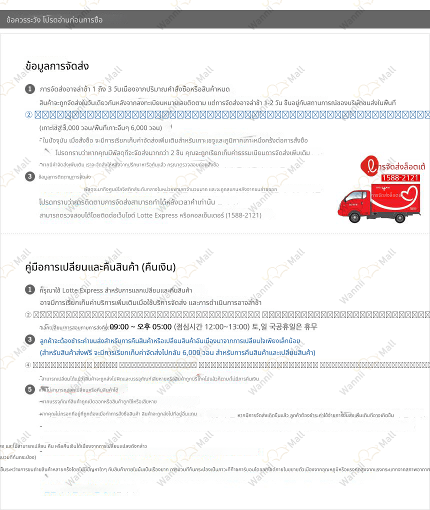 • เมื่อยื่นคำขอเปลี่ยน/คืนสินค้า โปรดติดต่อศูนย์บริการลูกค้า Wannii Mall (together1@wannii.com หรือ 070-4256-8800) เป็นอันดับแรก