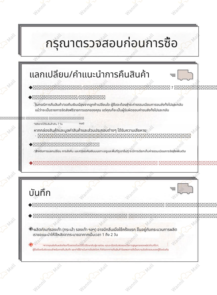 • หากคุณต้องการเปลี่ยนหรือคืนสินค้า กรุณายื่นคำขอภายใน 7 วัน หลังจากได้รับสินค้า โดยติดต่อศูนย์บริการลูกค้า Wannii Mall (together1@wannii.com หรือ 070-4256-8800)