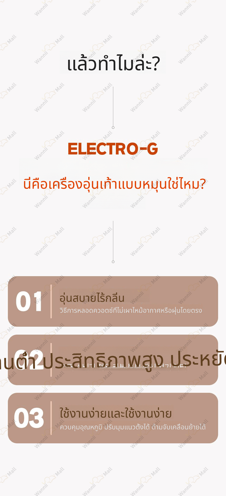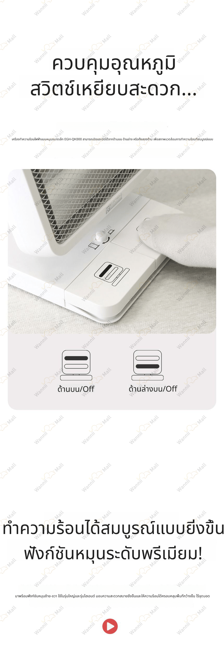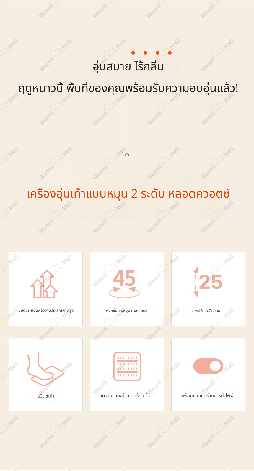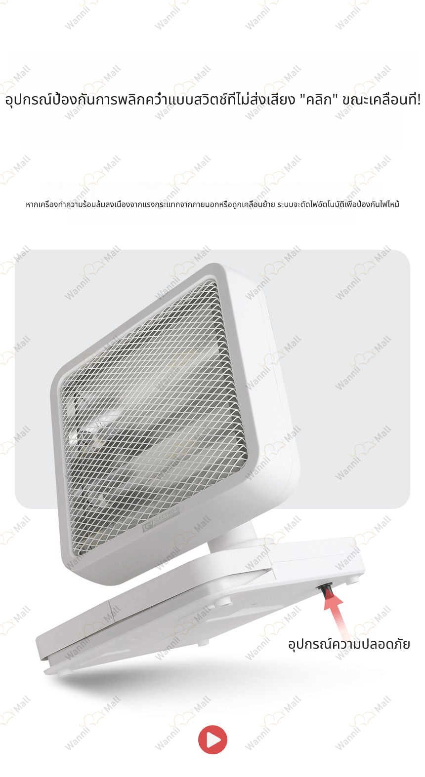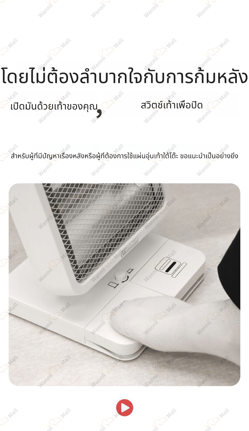 เครื่องทำความร้อนมินิแบบหมุนได้ สำหรับเท้า สีขาว สวิตช์เท้า กำลังไฟต่ำ ความร้อนสูง พกพาง่าย ที่จับ หมุนซ้าย-ขวา ปรับมุมบน-ล่าง