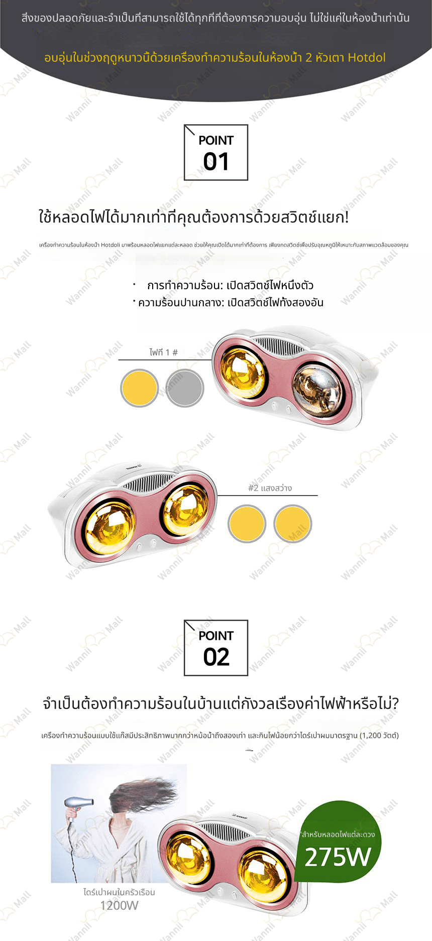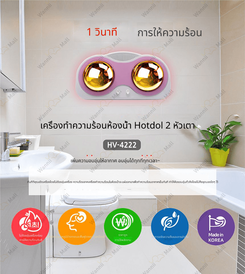 - โฮม > เครื่องใช้ไฟฟ้า/อิเล็กทรอนิกส์ > เครื่องใช้ไฟฟ้าภายในบ้านขนาดใหญ่ > เครื่องทำความร้อนในห้องน้ำ Ver ฮีทเตอร์ในห้องน้ำ 2 ช่อง 500w