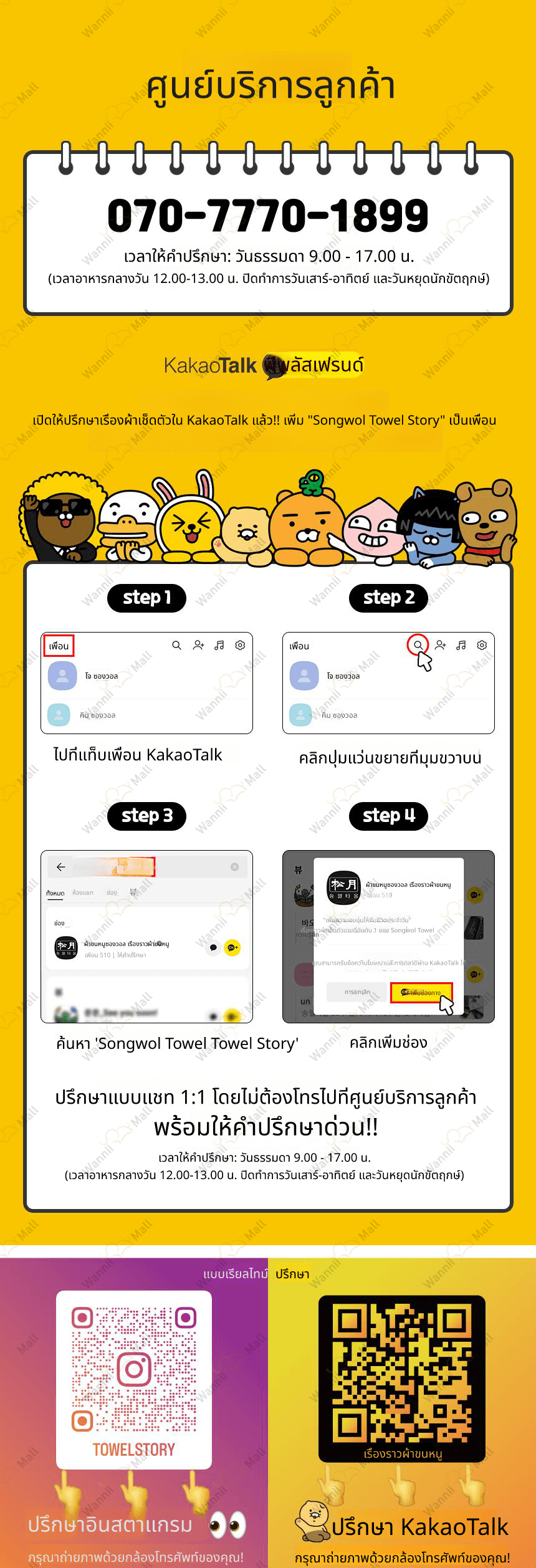 • สำหรับคำถามเกี่ยวกับการเปลี่ยน/คืนสินค้า โปรดติดต่อ (together1@wannii.com หรือ 070-4256-8800) เราจะตอบกลับตามลำดับ
