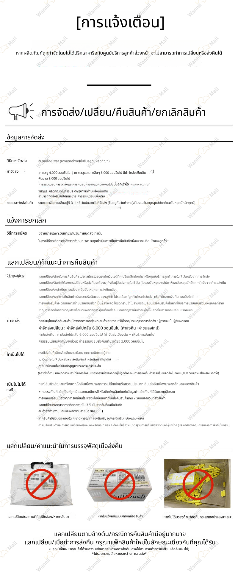 • กรณีที่สินค้ามีตำหนิ หรือจัดส่งผิดพลาด ทาง Wannii Mall จะเป็นผู้รับผิดชอบค่าจัดส่ง