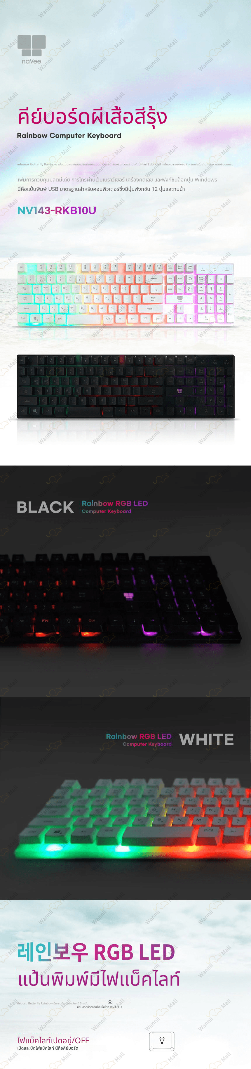 โฮม > เครื่องใช้ไฟฟ้า/อิเล็กทรอนิกส์ > คอมพิวเตอร์/แล็ปท็อป/อุปกรณ์ต่อพ่วง > แป้นพิมพ์/เมาส์ > คีย์บอร์ด RGB Nabee NV143-RKB10U สีรุ้ง