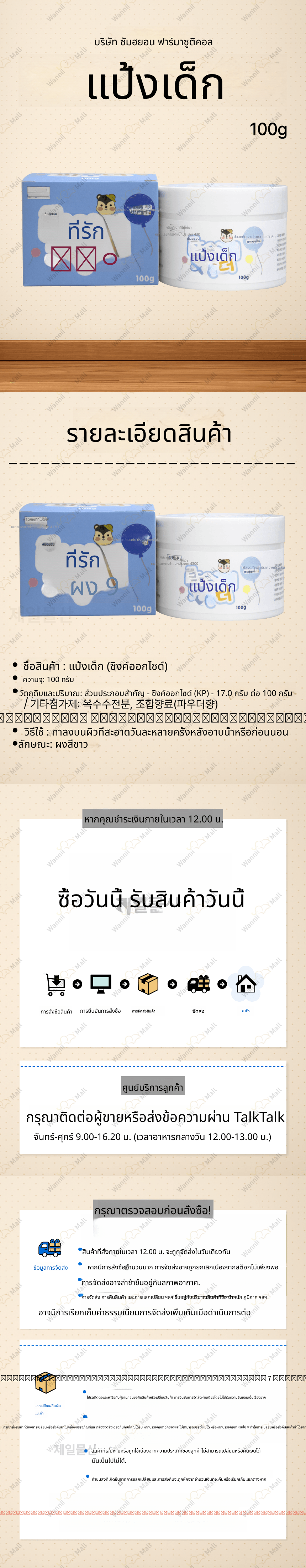 - โฮม > การคลอดบุตร/เด็กอ่อน > ของใช้ส่วนตัว > ผลิตภัณฑ์เพื่อสุขอนามัย/สุขภาพ > Samhyun Baby Powder 100g 1 ชิ้น สำหรับผื่นผ้าอ้อม เด็กแรกเกิด ทารก