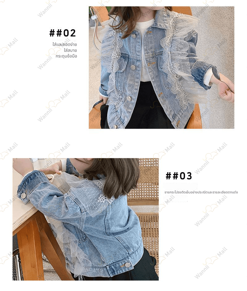 เสื้อแจ็คเก็ตยีนส์ชีฟองลูกไม้ระบายสำหรับเด็กผู้หญิง