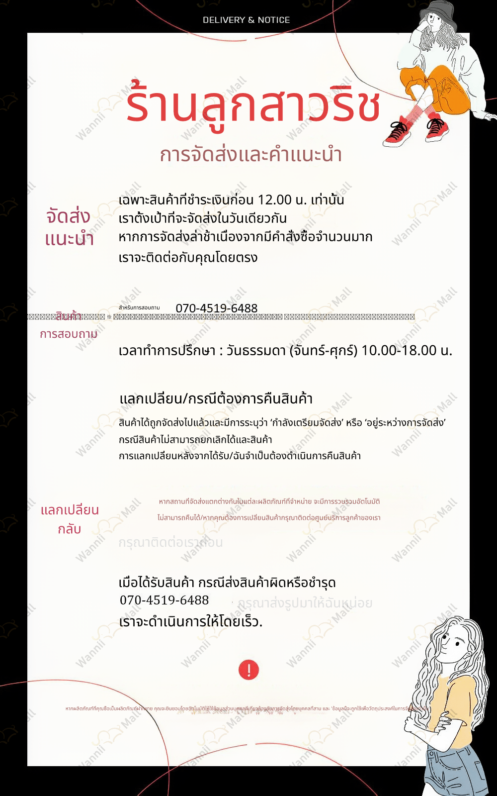 • หากคุณต้องการเปลี่ยนหรือคืนสินค้า กรุณายื่นคำขอภายใน 7 วัน หลังจากได้รับสินค้า โดยติดต่อศูนย์บริการลูกค้า Wannii Mall (together1@wannii.com หรือ 070-4256-8800)