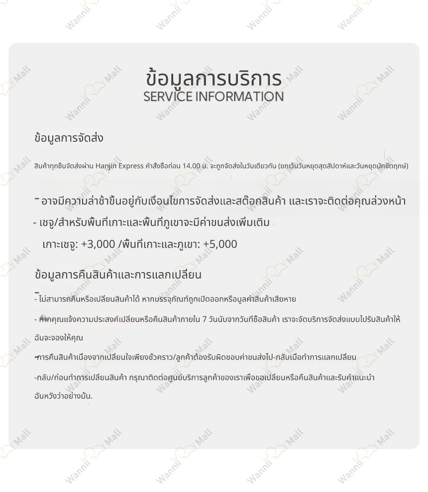 • กรณีเปลี่ยน/คืนเนื่องจากสินค้ามีตำหนิ หรือจัดส่งผิดพลาด ทาง Wannii Mall จะเป็นผู้รับผิดชอบค่าจัดส่ง