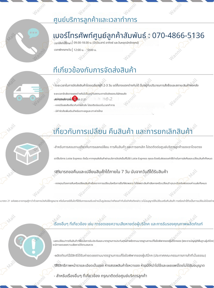 • หากคุณต้องการเปลี่ยนหรือคืนสินค้า กรุณายื่นคำขอภายใน 7 วัน หลังจากได้รับสินค้า โดยติดต่อศูนย์บริการลูกค้า Wannii Mall (together1@wannii.com หรือ 070-4256-8800)
