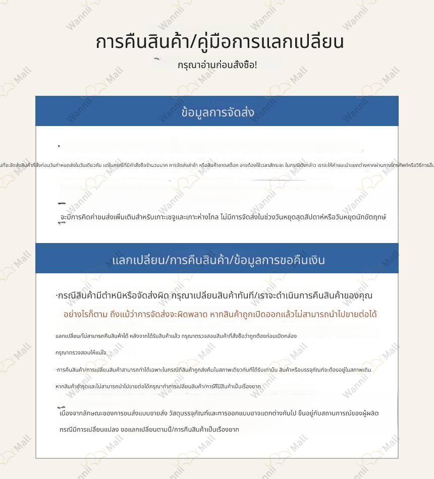 • กรณีที่สินค้ามีตำหนิ หรือจัดส่งผิดพลาด ทาง Wannii Mall จะเป็นผู้รับผิดชอบค่าจัดส่ง