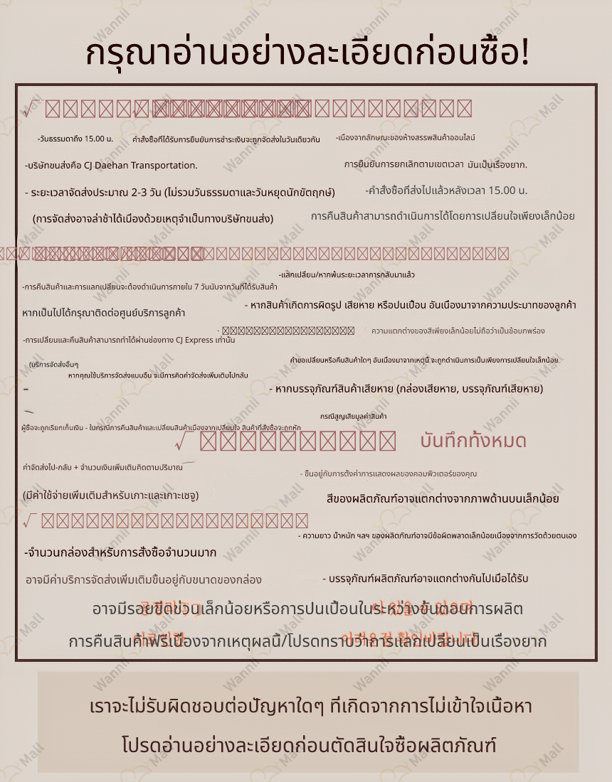 • หากคุณต้องการเปลี่ยนหรือคืนสินค้า กรุณายื่นคำขอภายใน 7 วัน หลังจากได้รับสินค้า โดยติดต่อศูนย์บริการลูกค้า Wannii Mall (together1@wannii.com หรือ 070-4256-8800)