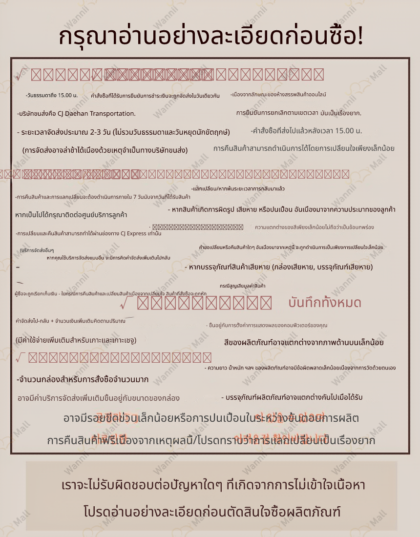 • หากคุณต้องการเปลี่ยนหรือคืนสินค้า กรุณายื่นคำขอภายใน 7 วัน หลังจากได้รับสินค้า โดยติดต่อศูนย์บริการลูกค้า Wannii Mall (together1@wannii.com หรือ 070-4256-8800)