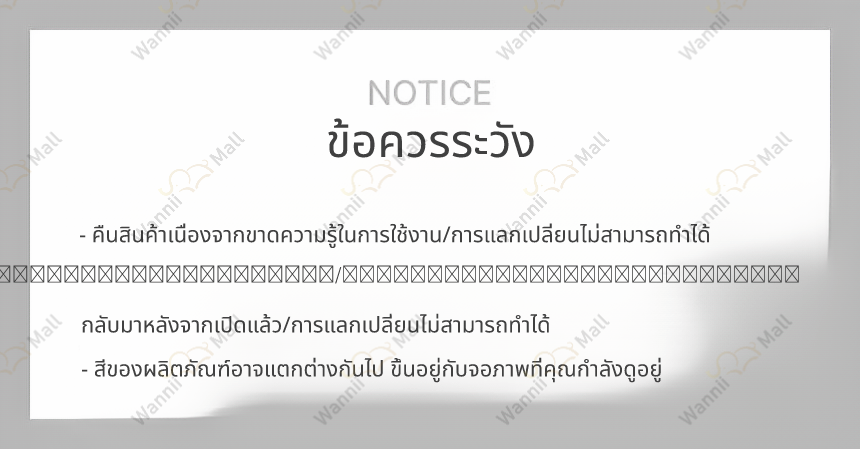 • หากคุณต้องการเปลี่ยนหรือคืนสินค้า กรุณายื่นคำขอภายใน 7 วัน หลังจากได้รับสินค้า โดยติดต่อศูนย์บริการลูกค้า Wannii Mall (together1@wannii.com หรือ 070-4256-8800)