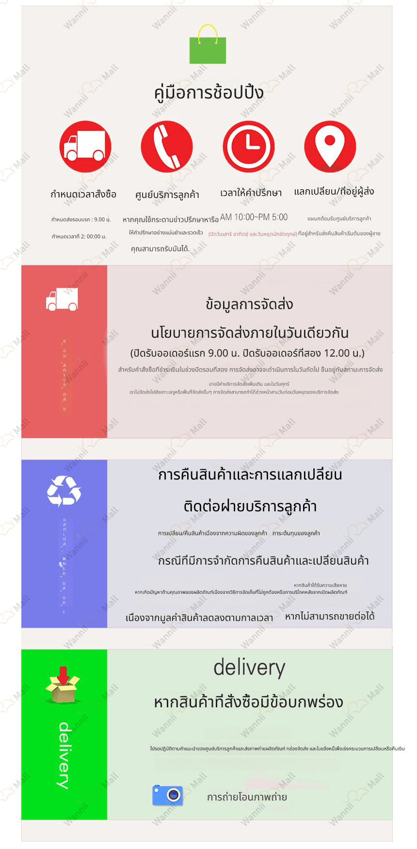 • กรณีที่สินค้ามีตำหนิ หรือจัดส่งผิดพลาด ทาง Wannii Mall จะเป็นผู้รับผิดชอบค่าจัดส่ง