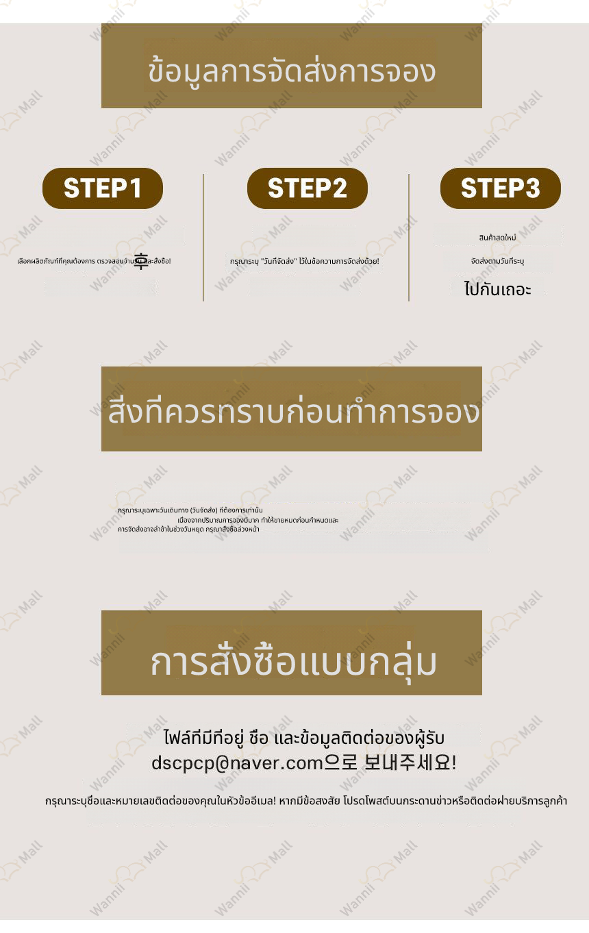 • หากคุณต้องการเปลี่ยนหรือคืนสินค้า กรุณายื่นคำขอภายใน 7 วัน หลังจากได้รับสินค้า โดยติดต่อศูนย์บริการลูกค้า Wannii Mall (together1@wannii.com หรือ 070-4256-8800)