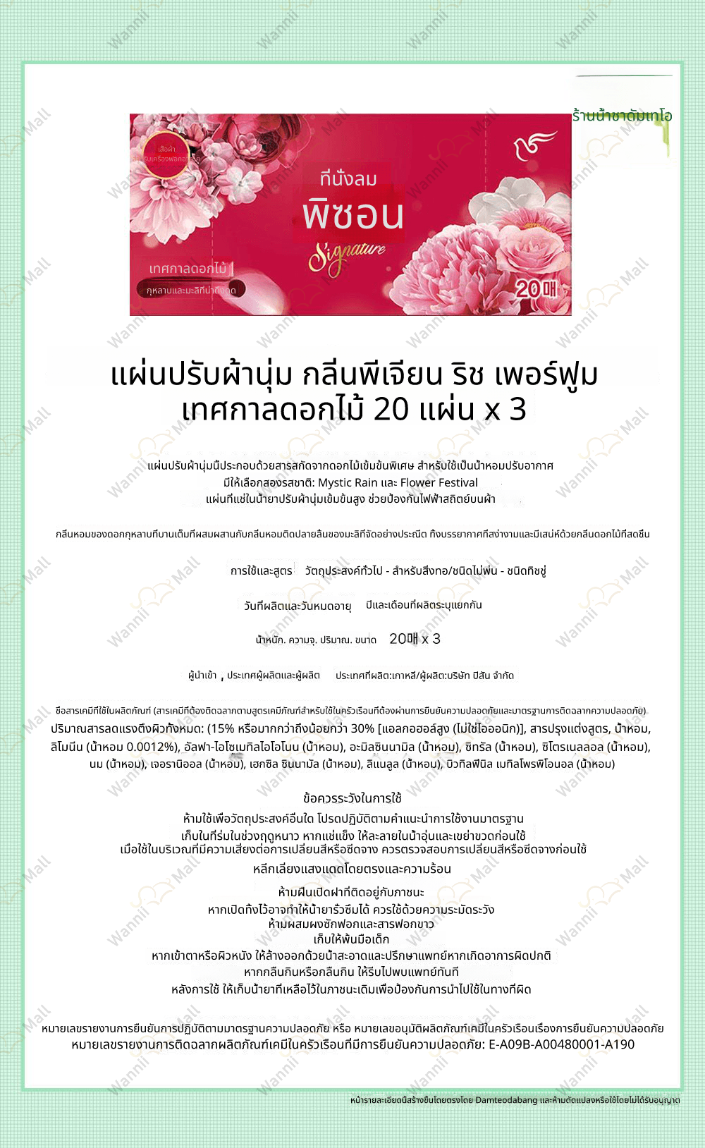 - โฮม > ของใช้ส่วนตัว > อุปกรณ์ซักรีด/ทำความสะอาด > น้ำยาปรับผ้านุ่ม > ผลิตภัณฑ์ปรับผ้านุ่มแบบแผ่น Pgeon Rich Perfume สำหรับเครื่องฟอกเสื้อผ้า Flower Festival 20 แผ่น x 3 ชิ้น กลิ่นหอม