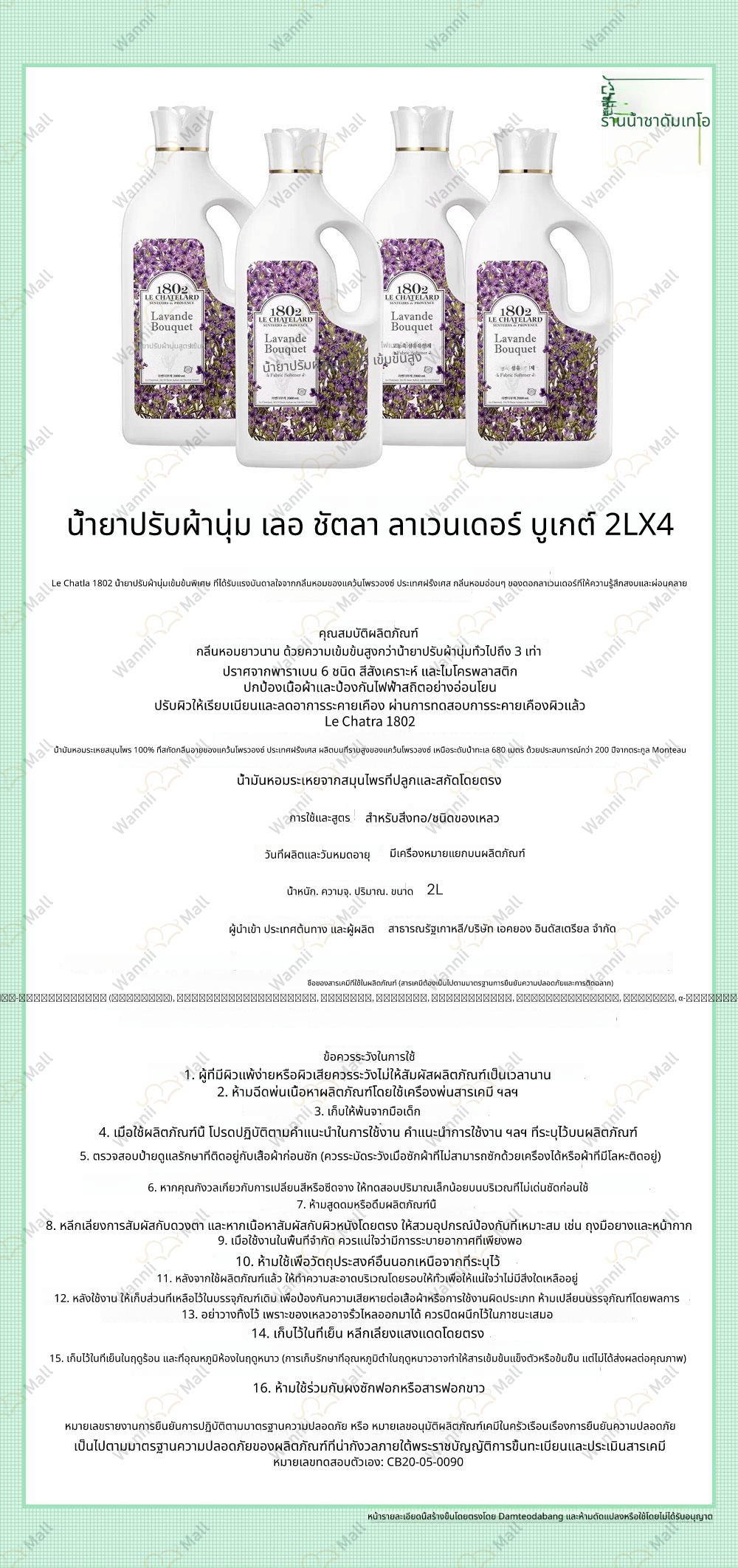 โฮม > ของใช้ส่วนตัว > อุปกรณ์ซักรีด/ทำความสะอาด > น้ำยาปรับผ้านุ่ม > น้ำยาปรับผ้านุ่ม Le Chatelard Lavender Bouquet 2 ลิตร x 4 ชิ้น