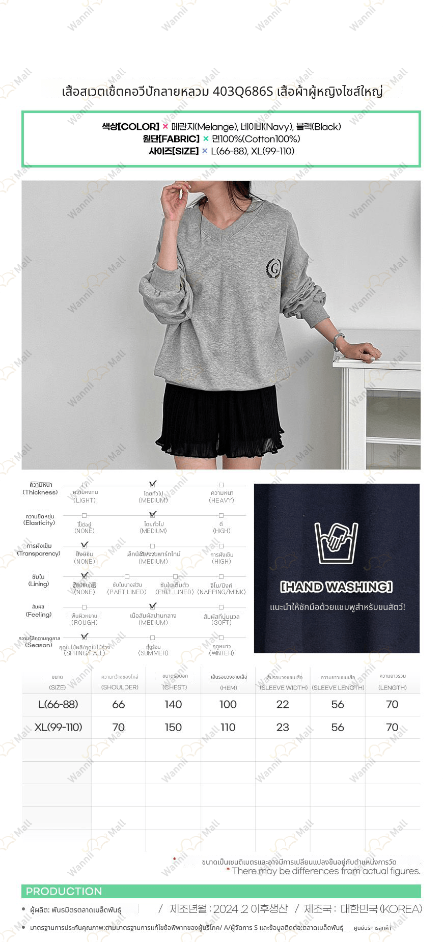 - โฮม > แฟชั่นและเครื่องประดับ > เสื้อผ้าผู้หญิง > HL] เสื้อยืดแขนยาวคอวีปักลายทรงหลวมสำหรับผู้หญิงไซส์ใหญ่
