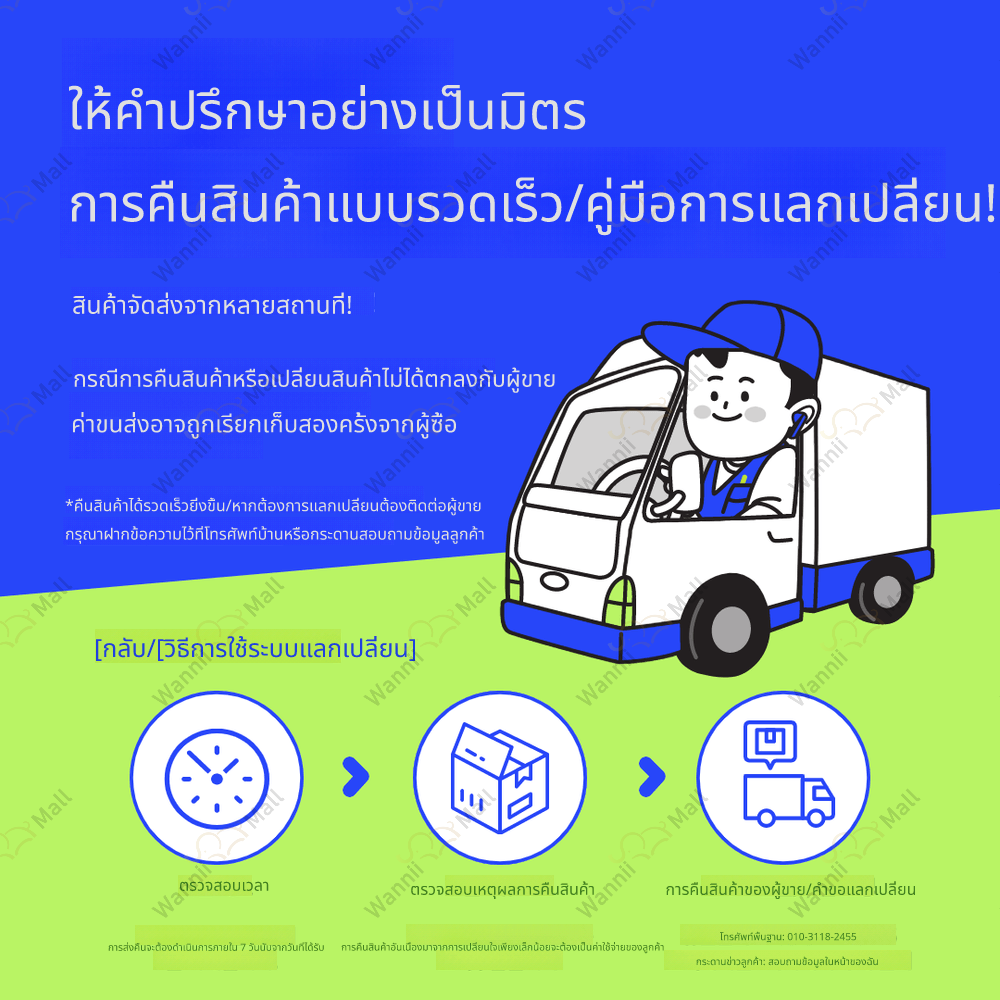 • หากคุณต้องการเปลี่ยนหรือคืนสินค้า กรุณายื่นคำขอภายใน 7 วัน หลังจากได้รับสินค้า โดยติดต่อศูนย์บริการลูกค้า Wannii Mall (together1@wannii.com หรือ 070-4256-8800)