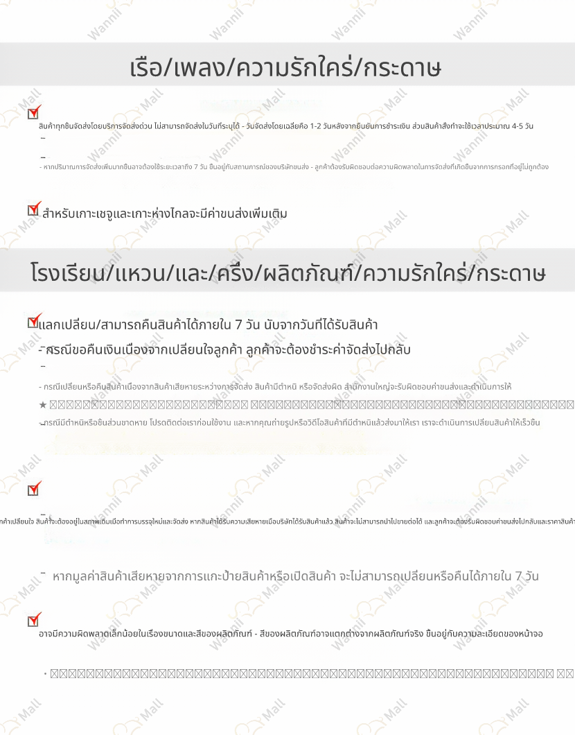 • สินค้าที่ถูกส่งคืนโดยไม่มีการแจ้งล่วงหน้า เราจะไม่รับผิดชอบ