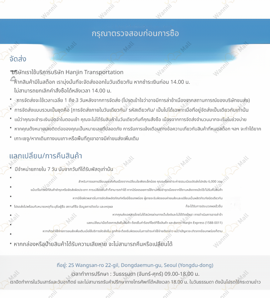 • หากคุณต้องการเปลี่ยนหรือคืนสินค้า กรุณายื่นคำขอภายใน 7 วัน หลังจากได้รับสินค้า โดยติดต่อศูนย์บริการลูกค้า Wannii Mall (together1@wannii.com หรือ 070-4256-8800)