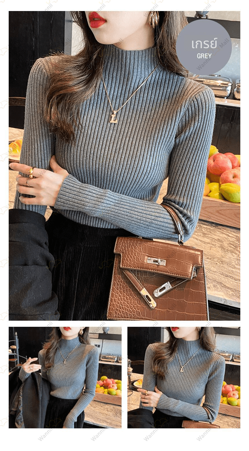 [1+1] เสื้อไหมพรมผู้หญิง แขนยาว คอเต่า/คอตั้ง ริบ (Ribbed Knit Turtleneck) (สินค้าพร้อมส่ง)