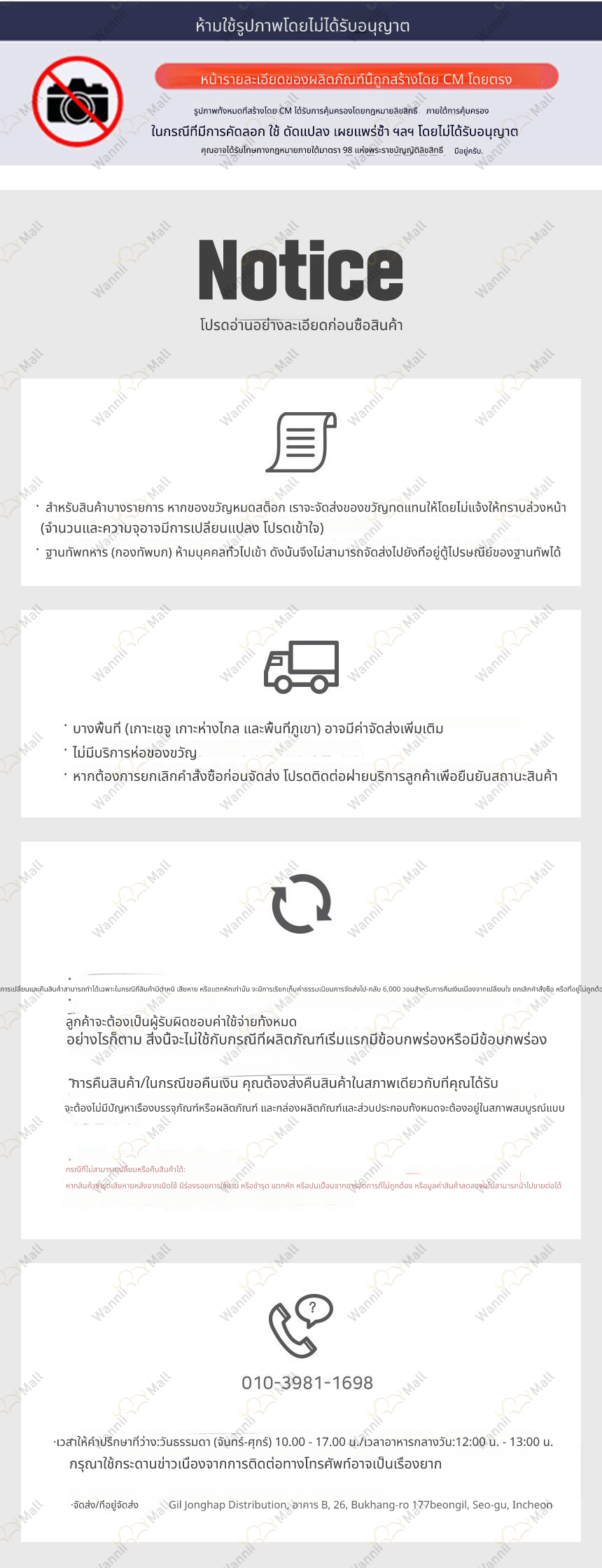 • หากคุณต้องการเปลี่ยนหรือคืนสินค้า กรุณายื่นคำขอภายใน 7 วัน หลังจากได้รับสินค้า โดยติดต่อศูนย์บริการลูกค้า Wannii Mall (together1@wannii.com หรือ 070-4256-8800)